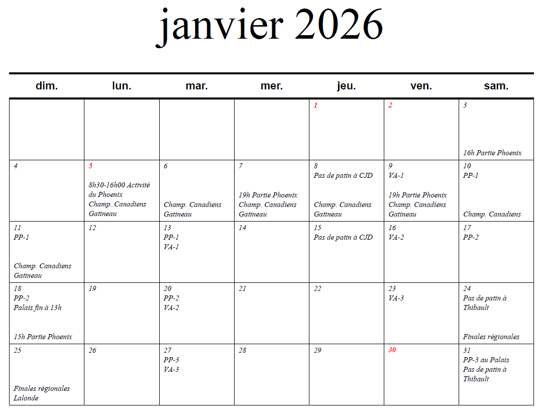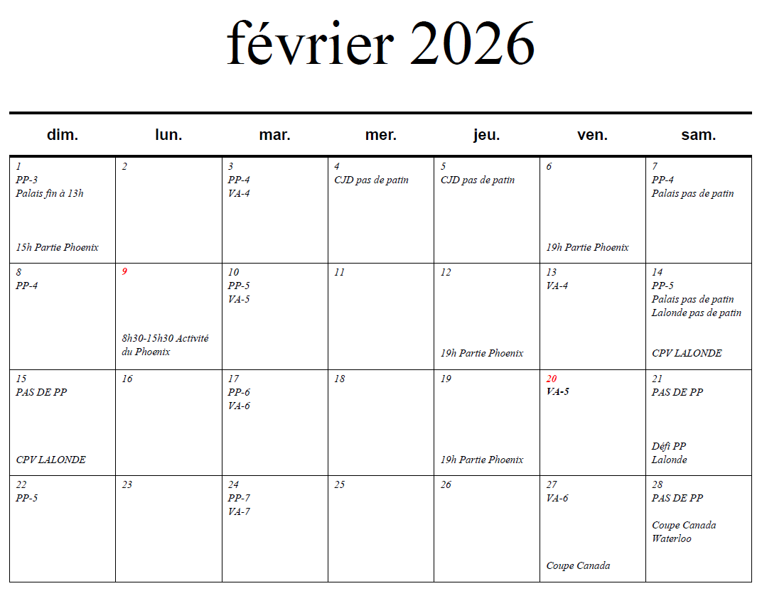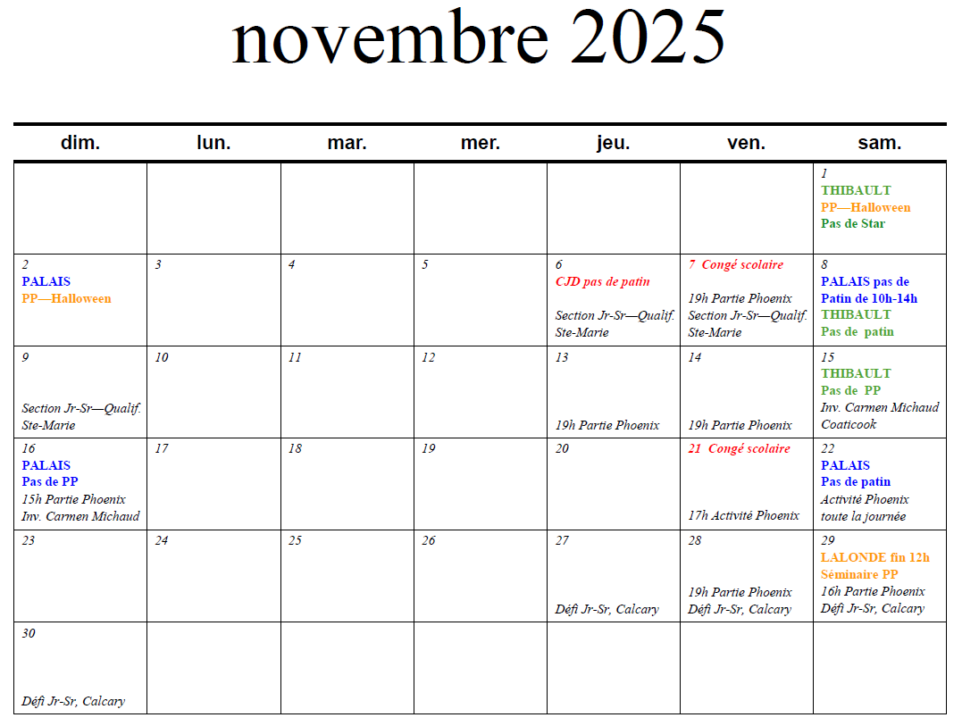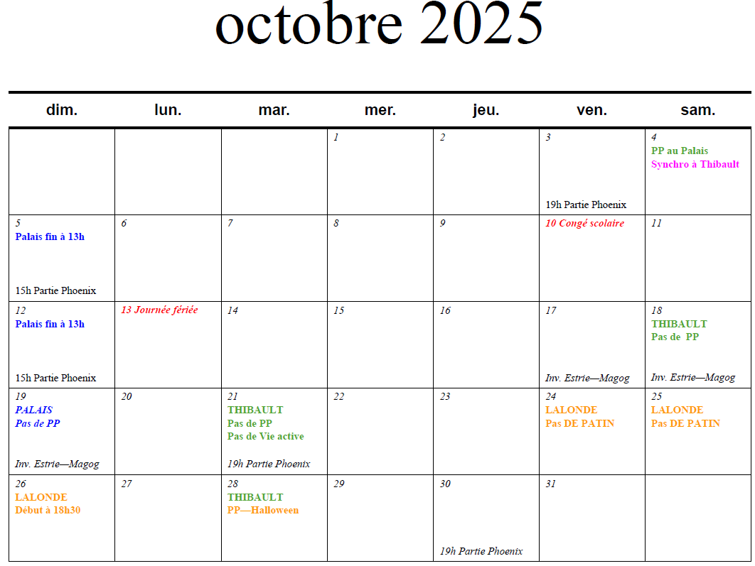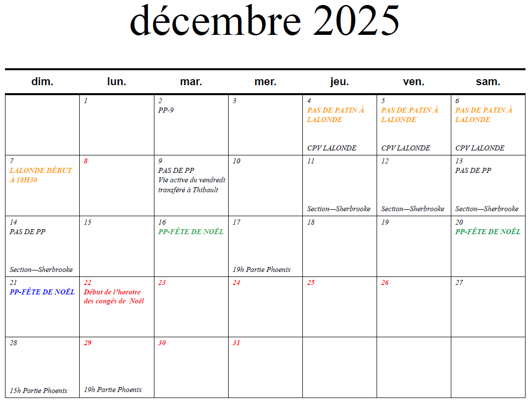 Voici les calendriers d’événements par mois. Vous y trouverez les dates des activités ou des changements d’horaire à venir