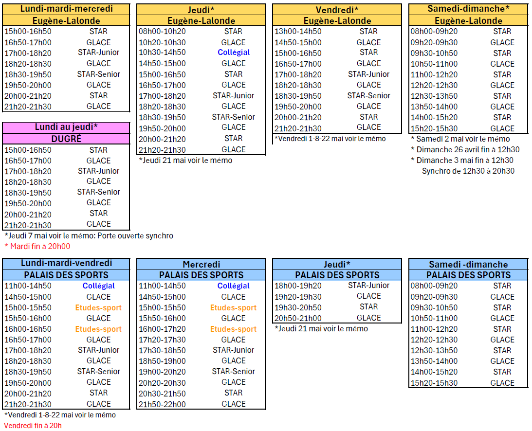 Veuillez consulter le mémo de la semaine pour connaître tous les changements d’horaire à chaque journée.
