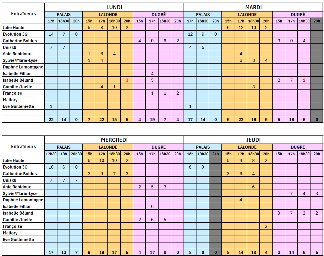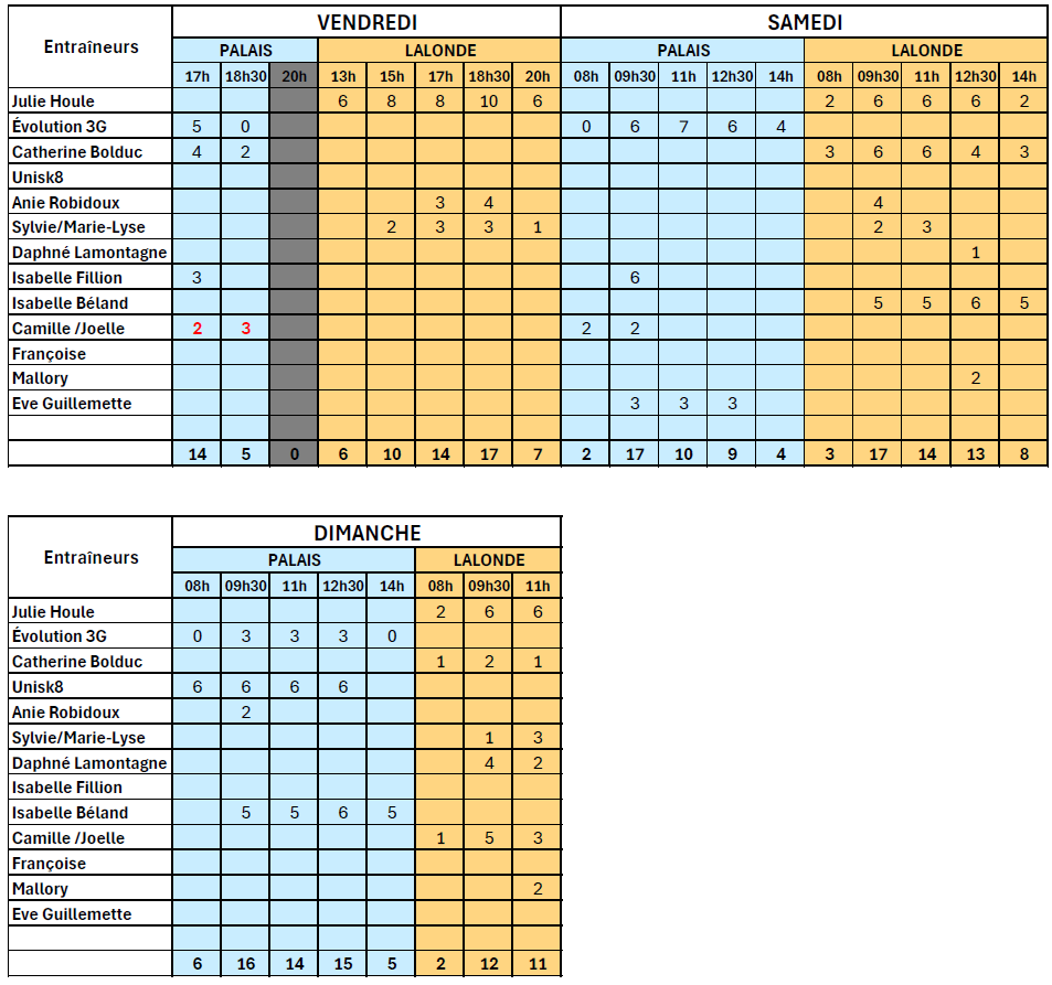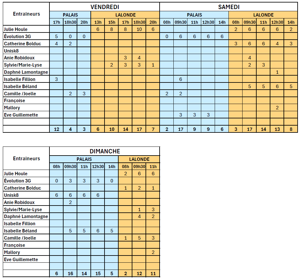 Note importante: Les adultes doivent patiner sur les blocs de 20h la semaine même s’il y a moins de 8 patineurs sur le bloc de 18h30. Sauf lorsqu’il n’y a pas de bloc de disponible à 20h: exemple le mardi à Dugré, le jeudi au Palais (19h30) et le vendredi au Palais.