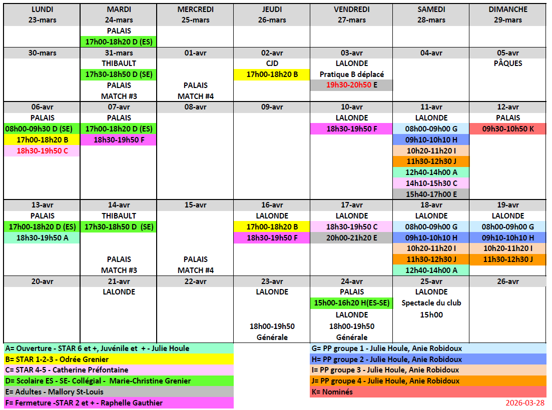 Pour chaque journée des générales, tous les patineurs concernés arrivent à 17h30.